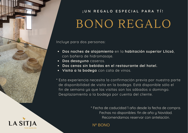Dos noches de alojamiento en la habitación superior Llicsó, con bañera de hidromasaje. Dos desayuno caseros. Dos cenas sin bebidas en el restaurante del hotel. Visita a la bodega con cata de vinos. * Esta experiencia necesita la confirmación previa por nuestra parte de disponibilidad de visita en la bodega. Está disponible sólo el fin de semana ya que las visitas son los sábados o domingo. Desplazamiento a la bodega por cuenta del cliente.